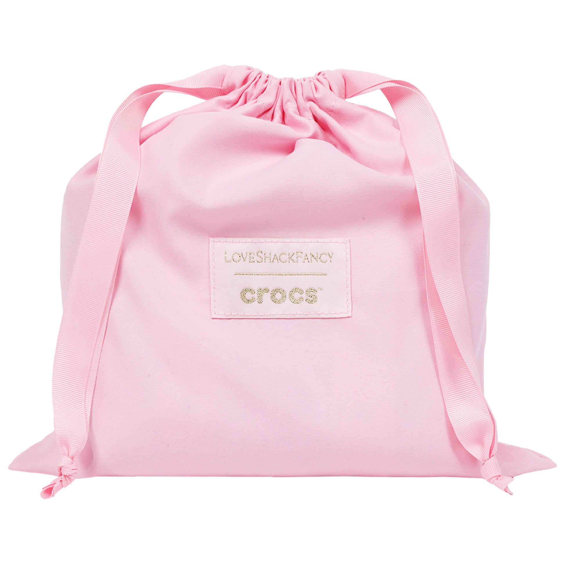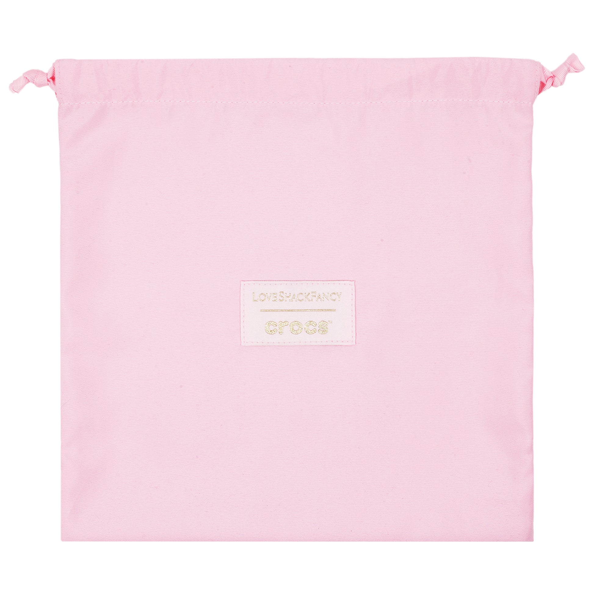 Fall in love at first carry . The Crocs x LoveShackFancy Mini Tote blends Crocs’ playful versatility with LoveShackFancy’s signature romantic aesthetic for a truly statement-making accessory. Designed with a clear structured body, this mini tote showcases a delicate floral LoveShackFancy print and is finished with feminine charm accents, including heart and bow details for an elevated, whimsical touch. Dual top handles and a removable adjustable crossbody strap let you style it your way—handheld or hands-free. Inside, a matching floral slip pocket which keeps essentials secure, while the transparent design makes this bag perfect for events, everyday styling, or showing off your favorite accessories. The included branded dust bag adds a luxe finishing touch, making it gift-ready right out of the box. Perfect for fans of fashion collaborations, this mini tote is where romance meets functionality.