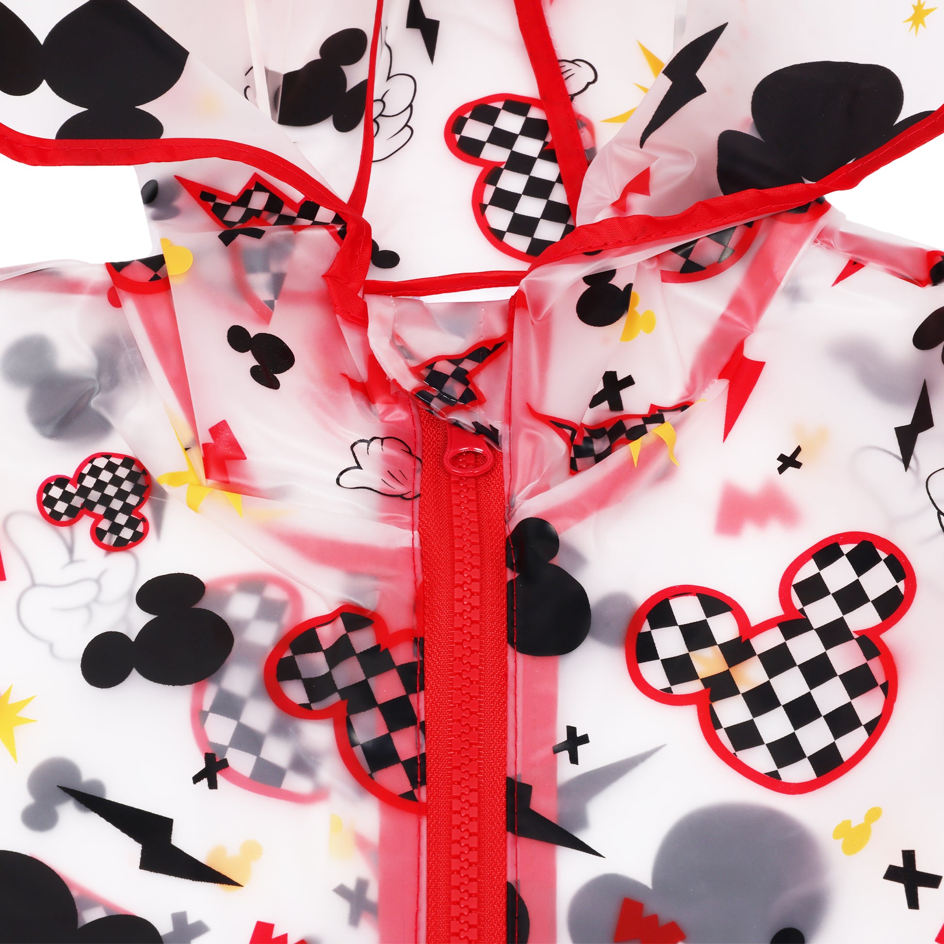 Make rainy days fun and full of Disney magic with this Mickey Mouse Toddler Raincoat! Designed for boys ages 4–5, this cheerful jacket features a colorful all-over Mickey print with lightning bolts, stars, and checkered ears that pop against a clear background trimmed in bright red.