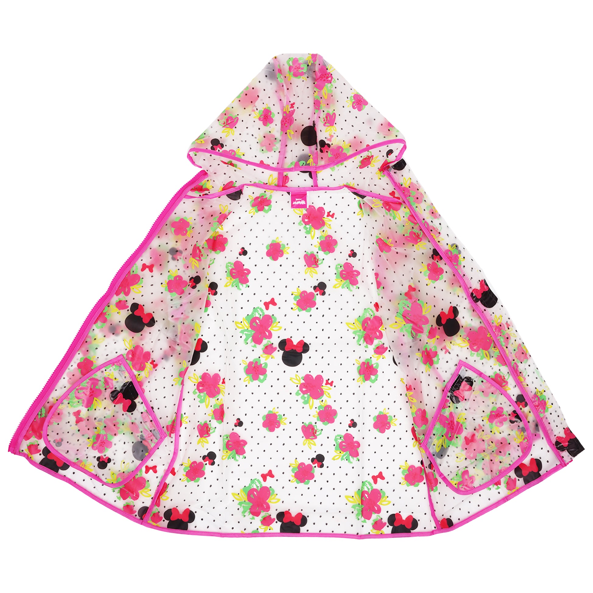 Keep rainy days fun and full of Disney charm with this officially licensed Minnie Mouse raincoat! Designed for little girls ages 4–5, this waterproof poncho features a cheerful Minnie Mouse floral print with black polka dots and bright pink trim. The lightweight transparent design includes a zip-up front, two front pockets, and a protective hood—making it perfect for splashing in puddles or heading to school on drizzly mornings.