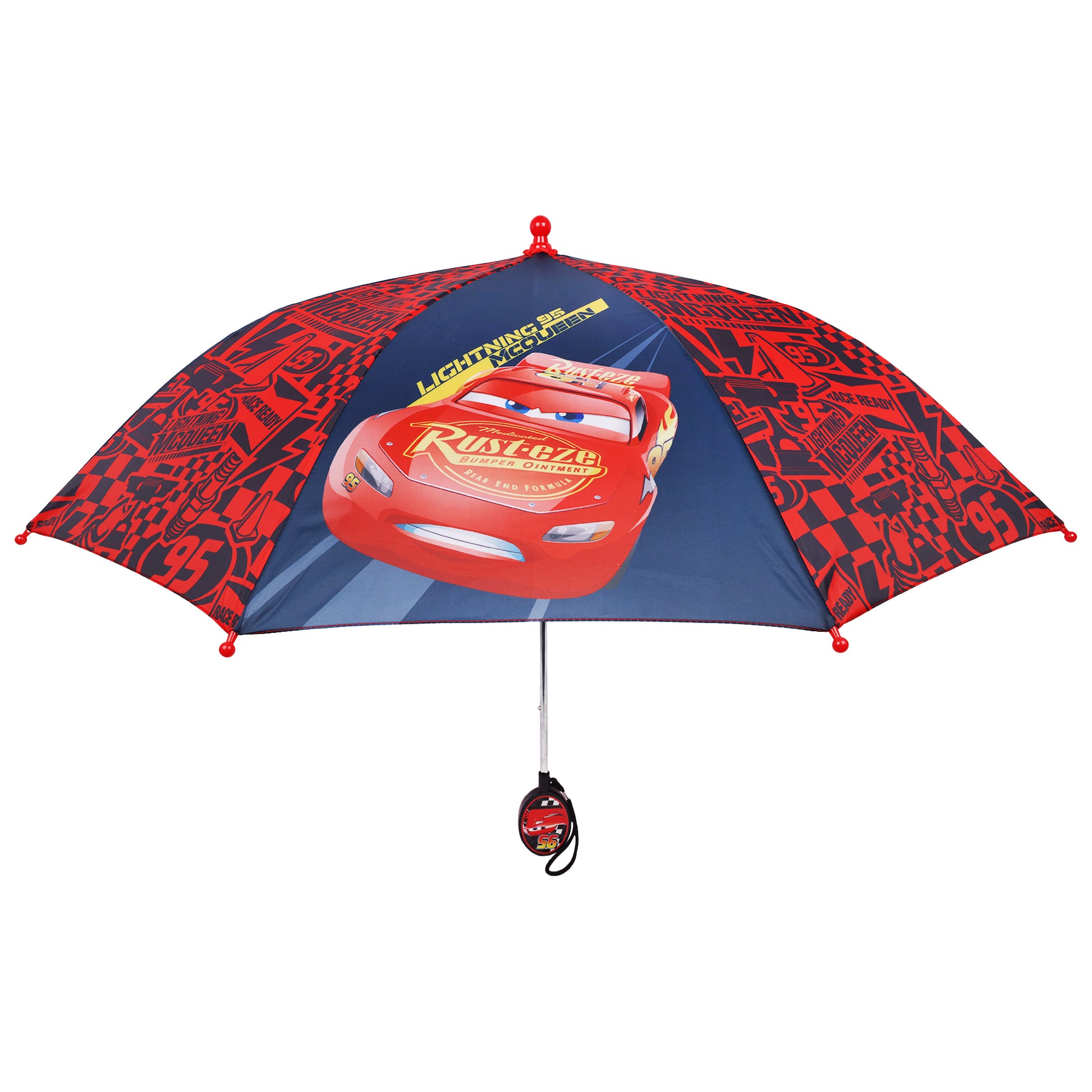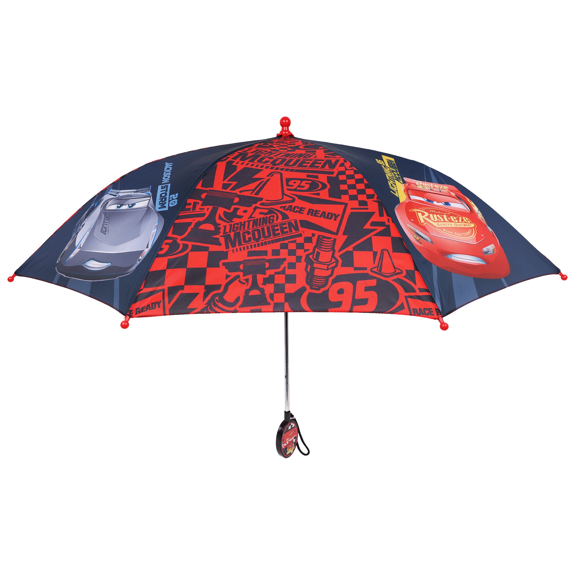 Rev up for rainy days with this Disney Pixar Cars kids umbrella featuring Lightning McQueen and Jackson Storm! Designed for young racers, it showcases bold red-and-navy checkered panels and dynamic character artwork. The 40-inch arc provides full rain coverage, while the durable frame and easy manual open make it perfect for little hands on the go.