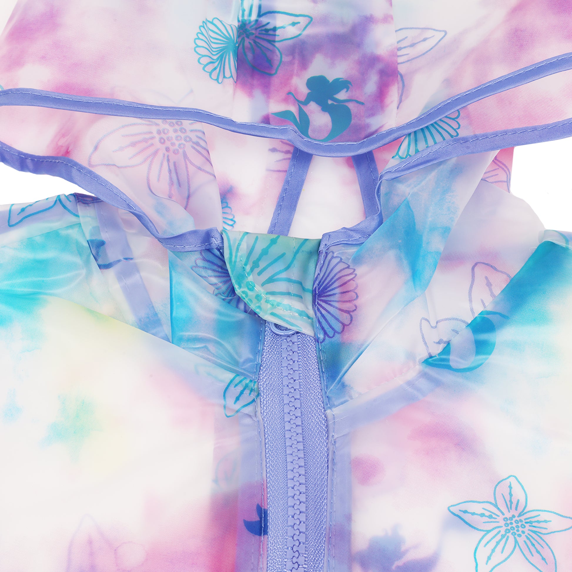 Bring a splash of magic to rainy days with this officially licensed Disney The Little Mermaid raincoat for girls! Designed for ages 4–5, this waterproof hooded jacket features Ariel silhouettes and ocean-inspired floral patterns in dreamy pastel tie-dye hues. The lightweight construction makes it perfect for layering, while the front zipper and roomy pockets keep little ones cozy and dry during drizzles or downpours.