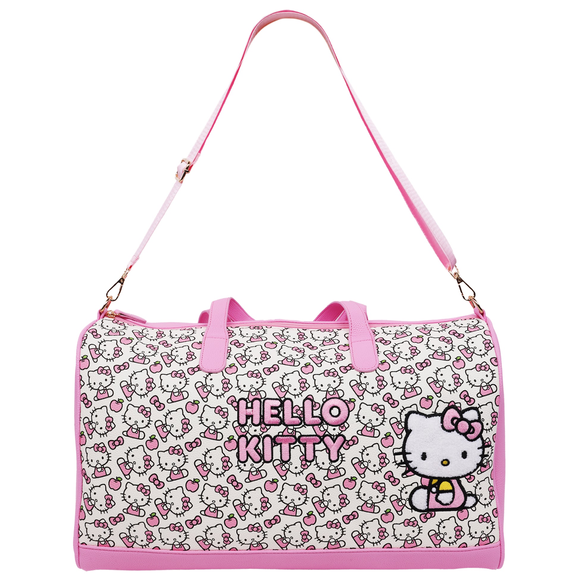 Travel in adorable style with this officially licensed Sanrio Hello Kitty Weekender Duffel Bag! Covered in an allover Hello Kitty and bow print with pops of pink apples, this spacious bag is perfect for weekend getaways, gym days, or everyday adventures. The plush chenille Hello Kitty patch and bold “HELLO KITTY” lettering add a touch of charm, while the trolley strap, top handles, and detachable shoulder strap make carrying easy and comfortable.