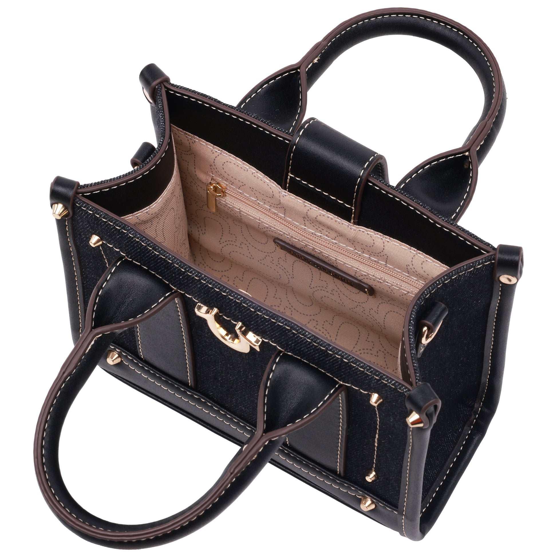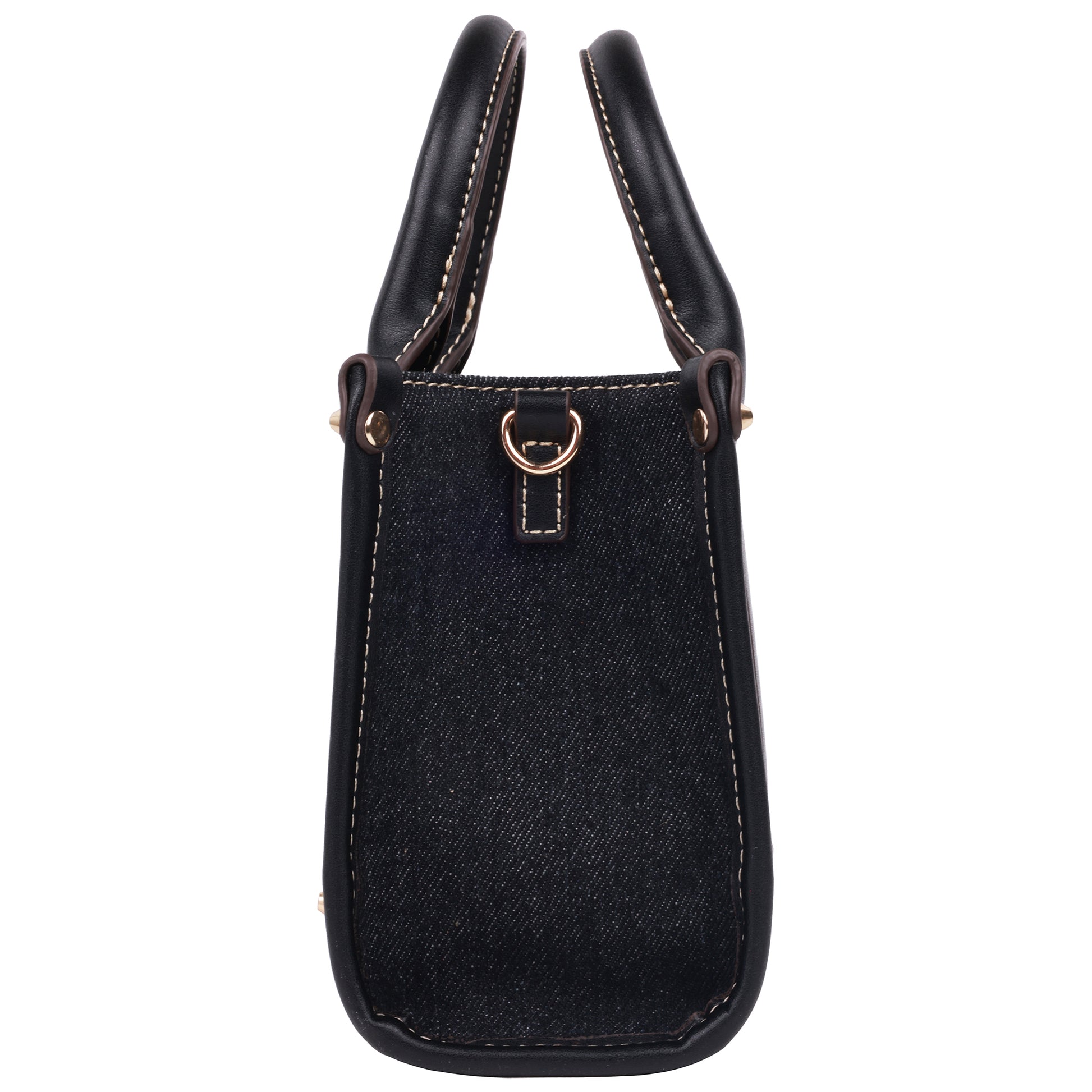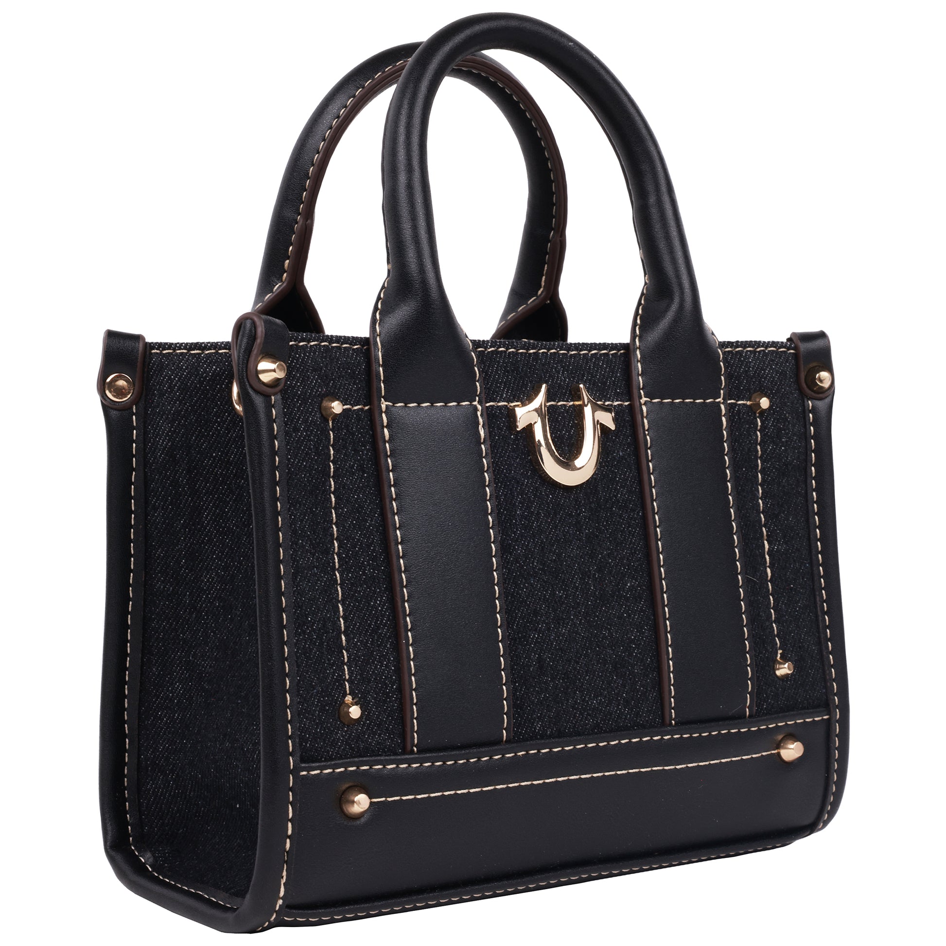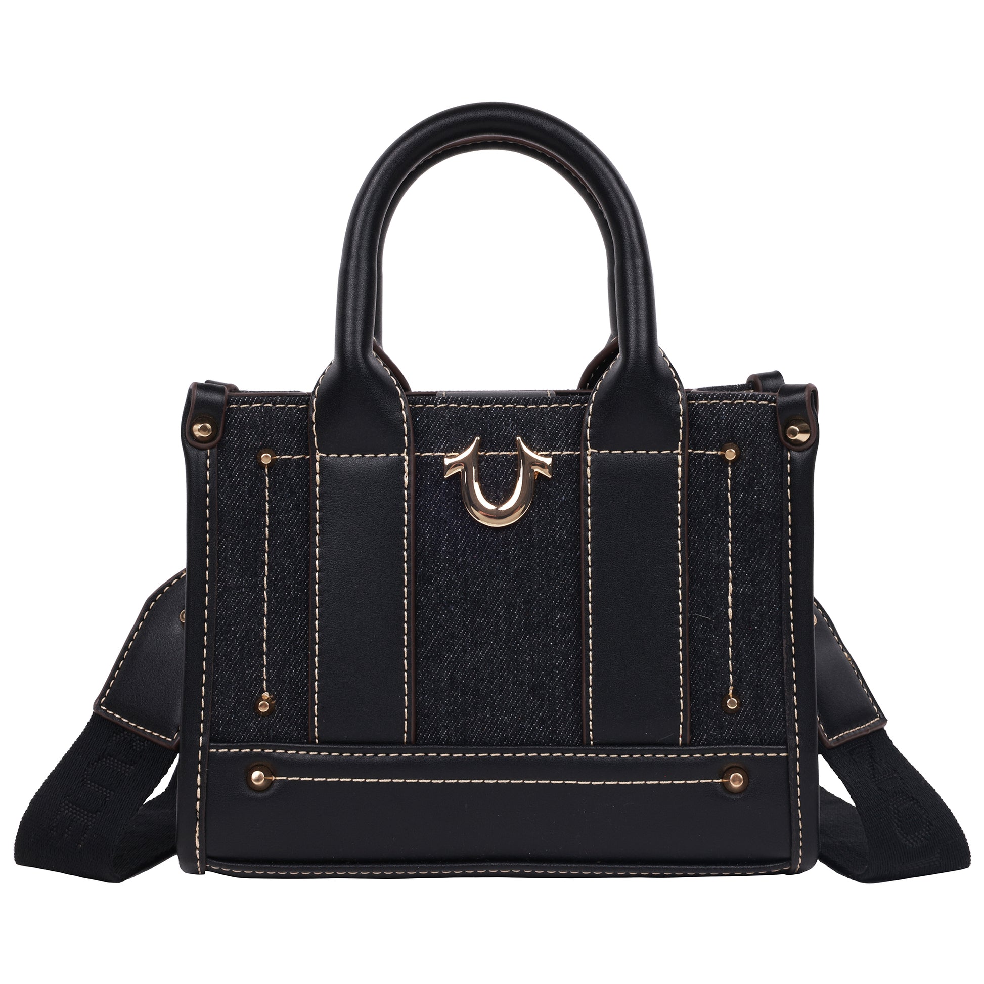 Sharp and structured, the True Religion Denim Logo Strap Mini Tote blends premium dark denim with smooth PU panels for a luxe, urban feel. Complete with a bold metal horseshoe logo, contrast stitching, and an adjustable logo webbing strap, this tote is made for everyday cool.