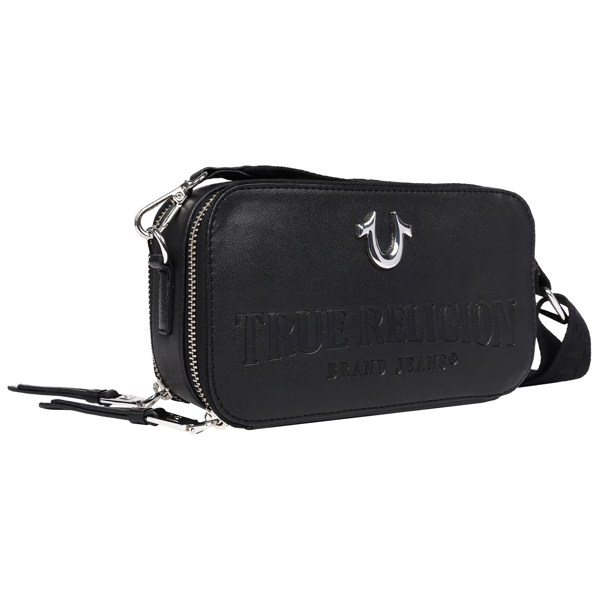 Stay stylish and organized with the True Religion Double-Zip Horseshoe Camera Bag. Designed with a sleek silhouette and embossed branding, this versatile bag combines contemporary fashion with practical functionality. The double-zip compartments offer ample space for your essentials, while the adjustable strap ensures a comfortable and customizable fit. Accented with a signature horseshoe emblem and premium detailing, this bag is perfect for casual outings or adding a chic touch to your look. Whether slung crossbody or carried by hand, this camera bag is the epitome of modern sophistication.