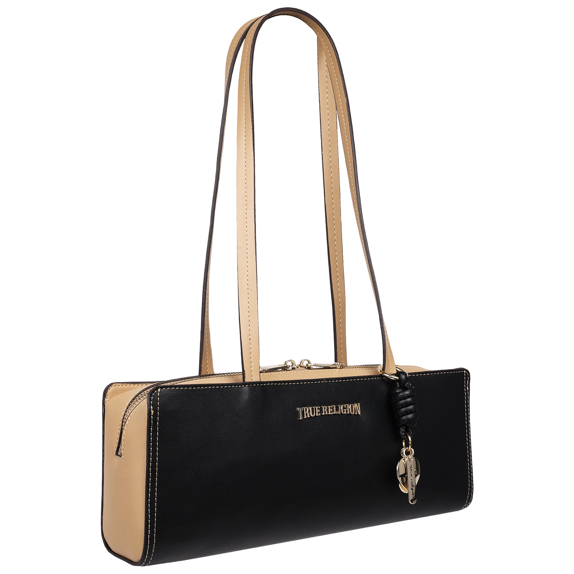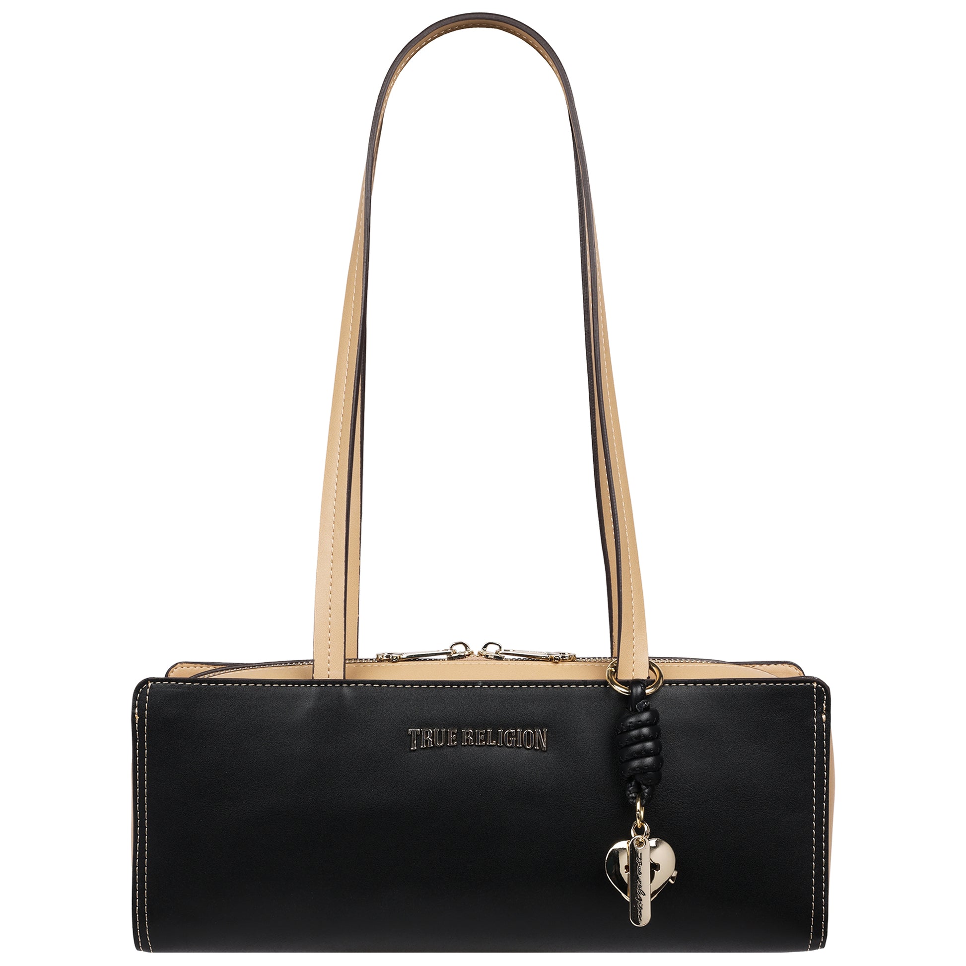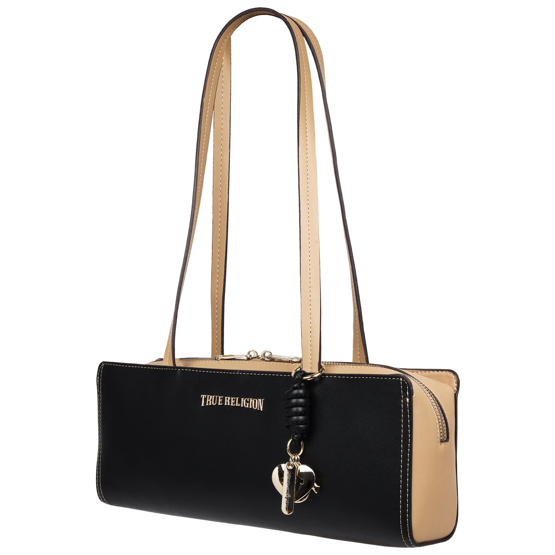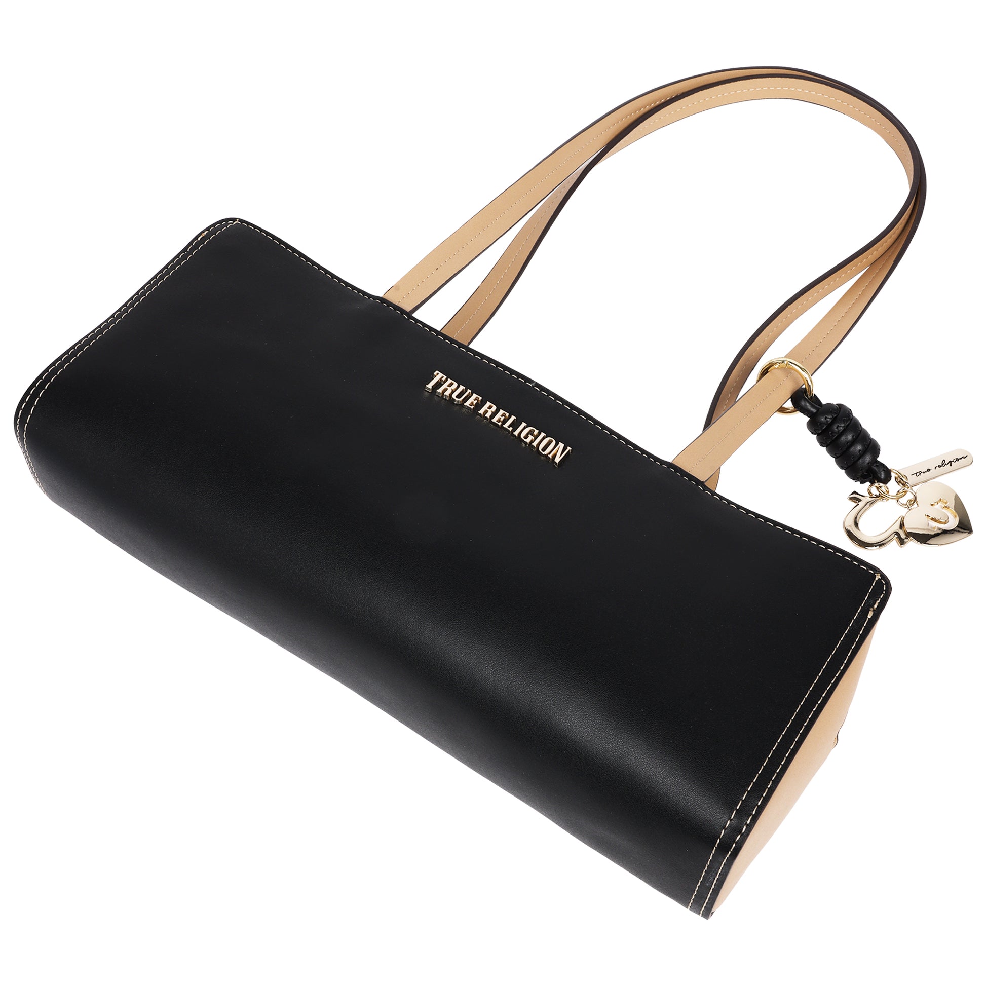 The True Religion East/West Modern Satchel blends sleek design with everyday function. Featuring a structured silhouette, dual shoulder straps, and gold-tone logo detailing, this bag is finished with a signature branded charm for a polished touch. A zip-top closure keeps your essentials secure, while the spacious interior with an inner zip pocket ensures organized storage for day-to-night wear.