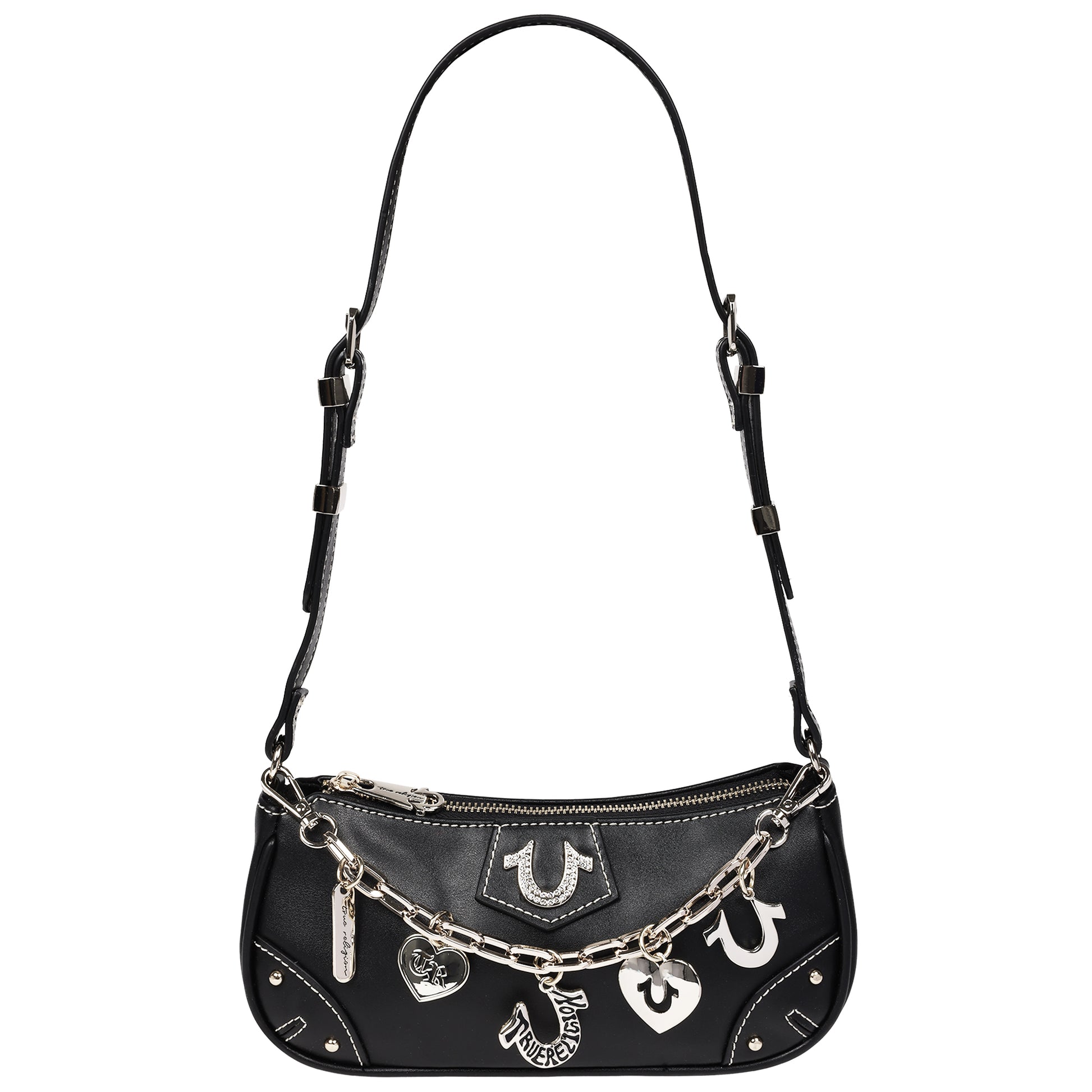 Make a bold style statement with the True Religion Horseshoe Chain Shoulder Bag. This sleek design features a polished chain adorned with signature logo charms, a crystal-embellished horseshoe patch, and adjustable shoulder straps for the perfect fit.