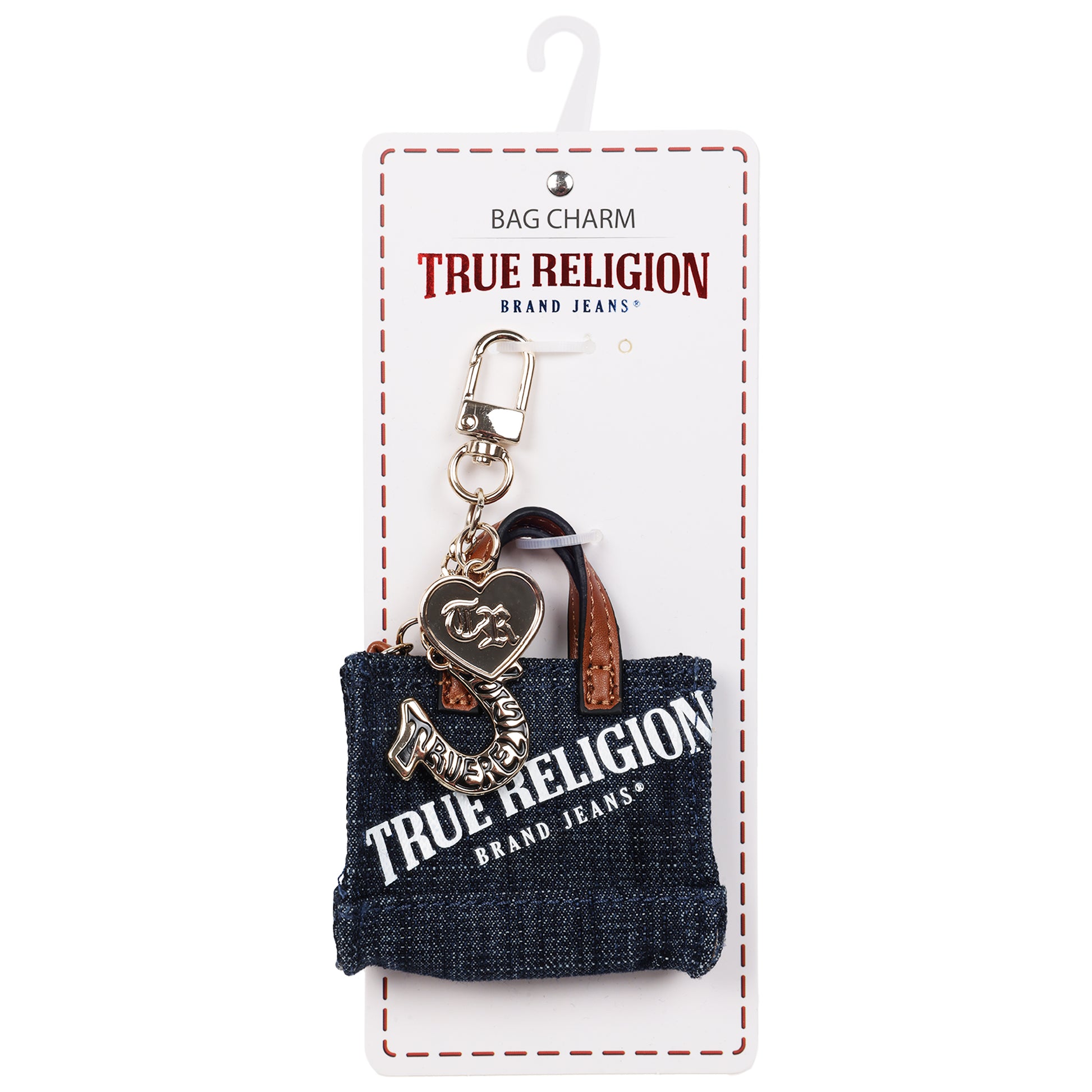 Show your signature denim style anywhere you go with this officially licensed True Religion Brand Jeans Bag Charm. Designed like a mini True Religion tote, this dark denim charm features contrast brown handles, gold-tone hardware, and signature logo detailing. Complete with the brand’s iconic horseshoe and heart charms, this stylish accessory clips easily to any bag or keyring—perfect for True Religion fans who love bold statement details.