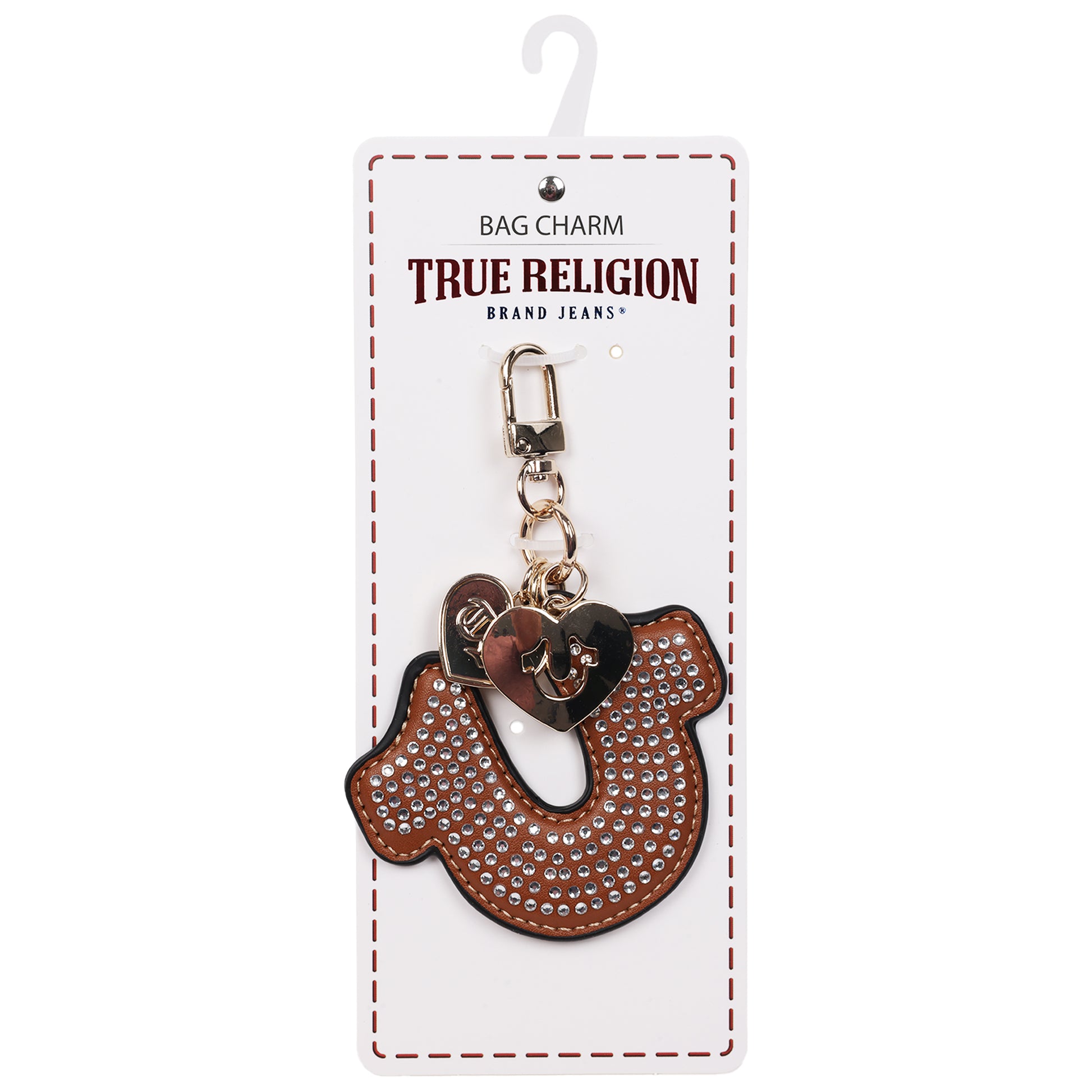 Add a touch of glam to your everyday essentials with this officially licensed True Religion Brand Jeans Bag Charm. Shaped in the brand’s iconic horseshoe logo, this cognac-tone charm is adorned with sparkling rhinestones for a standout finish. Gold-tone hardware and double heart pendants complete the luxe look, making it the perfect statement piece for your handbag, tote, or keyring.