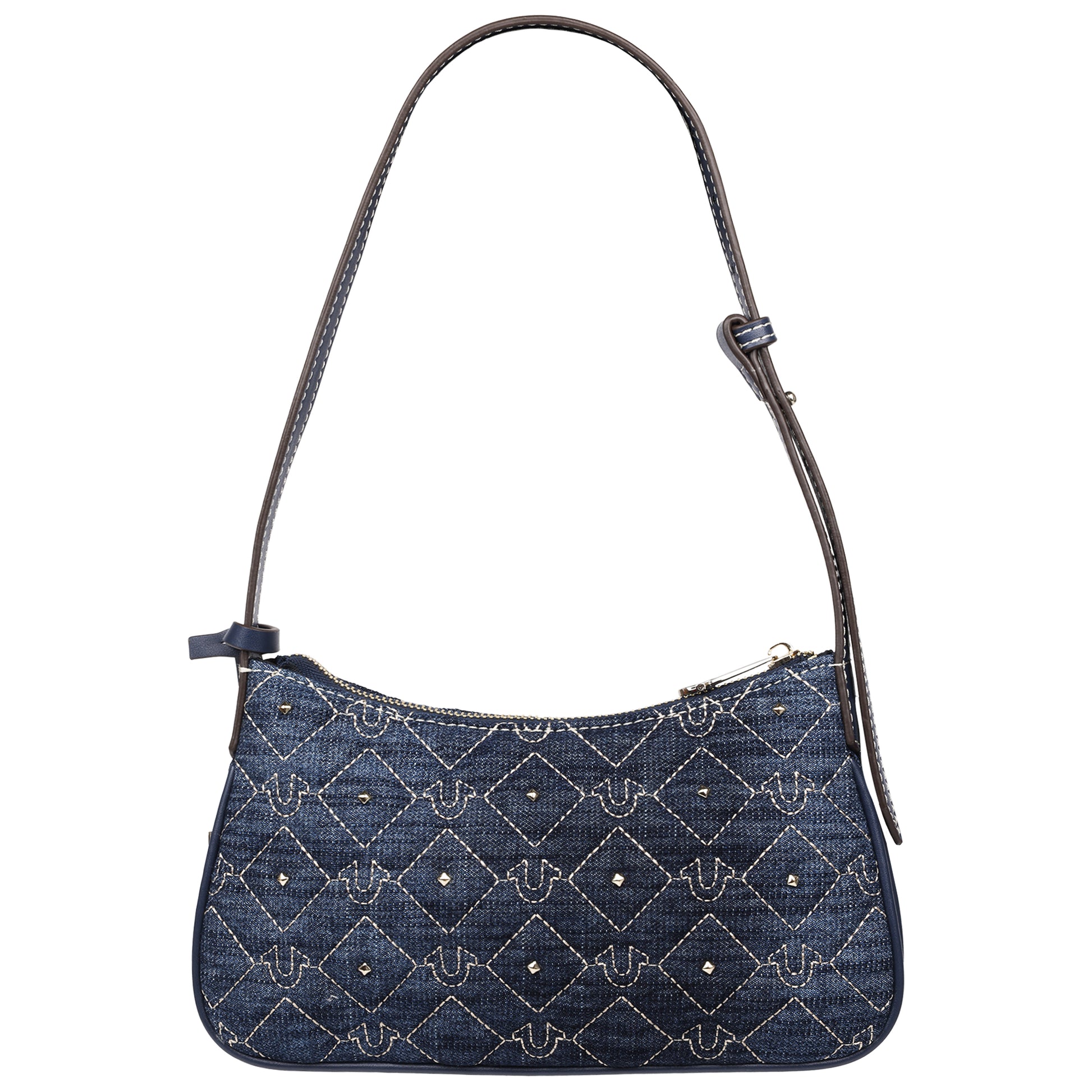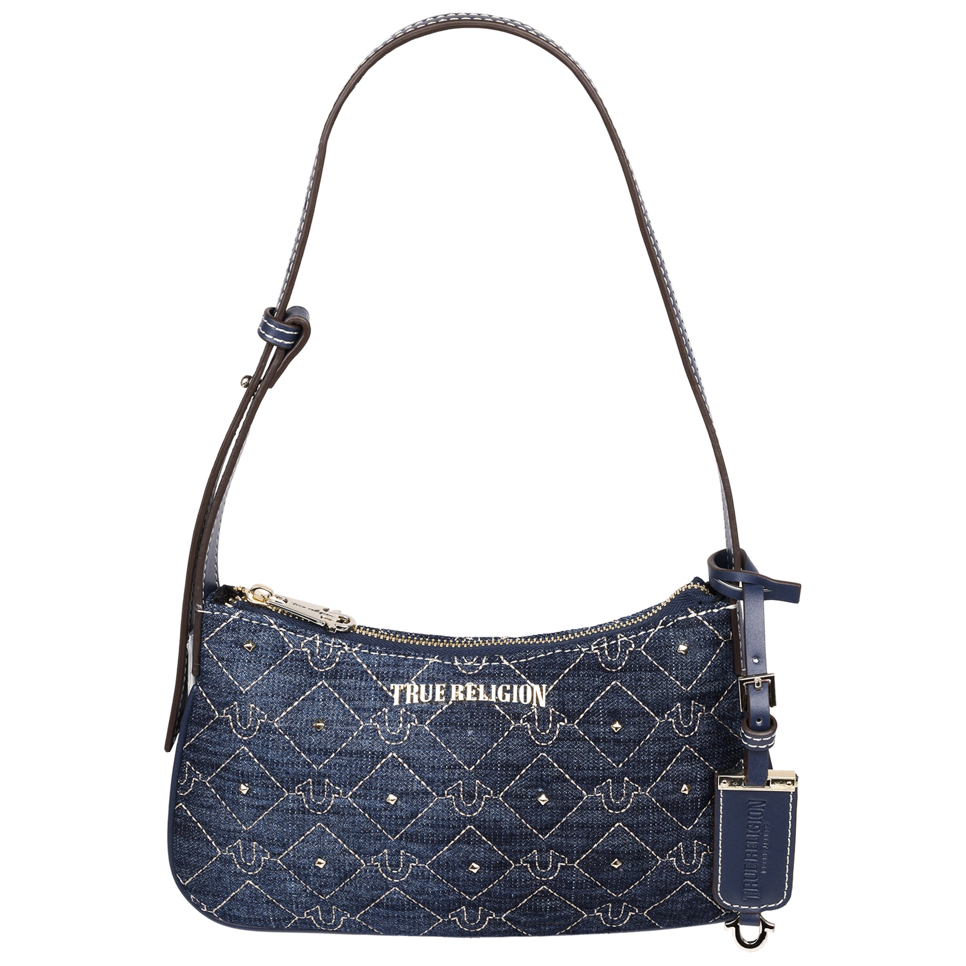 Elevate your everyday style with the True Religion Studded Denim Shoulder Bag. Designed with an all-over quilted horseshoe pattern, accented by gleaming stud details, this bag blends casual denim charm with luxe touches. The adjustable shoulder strap ensures a custom fit, while the zip-top closure and fully lined interior keep your essentials secure and organized.