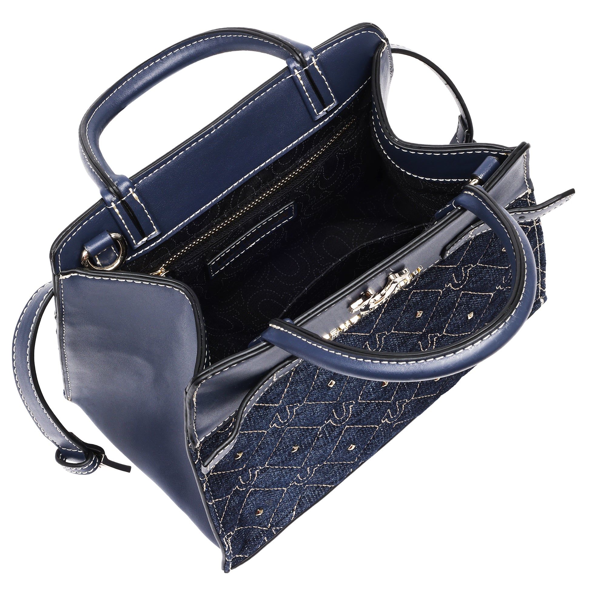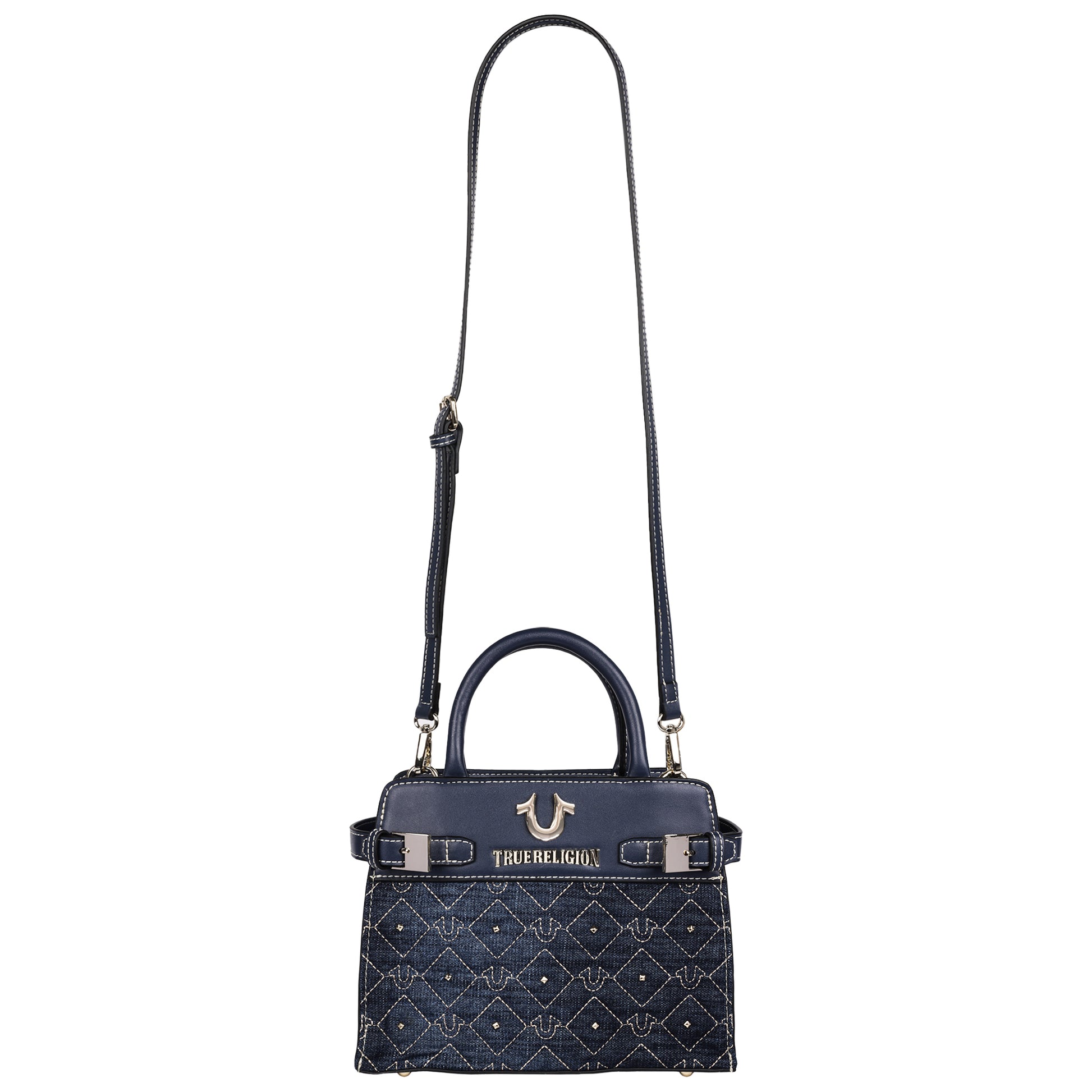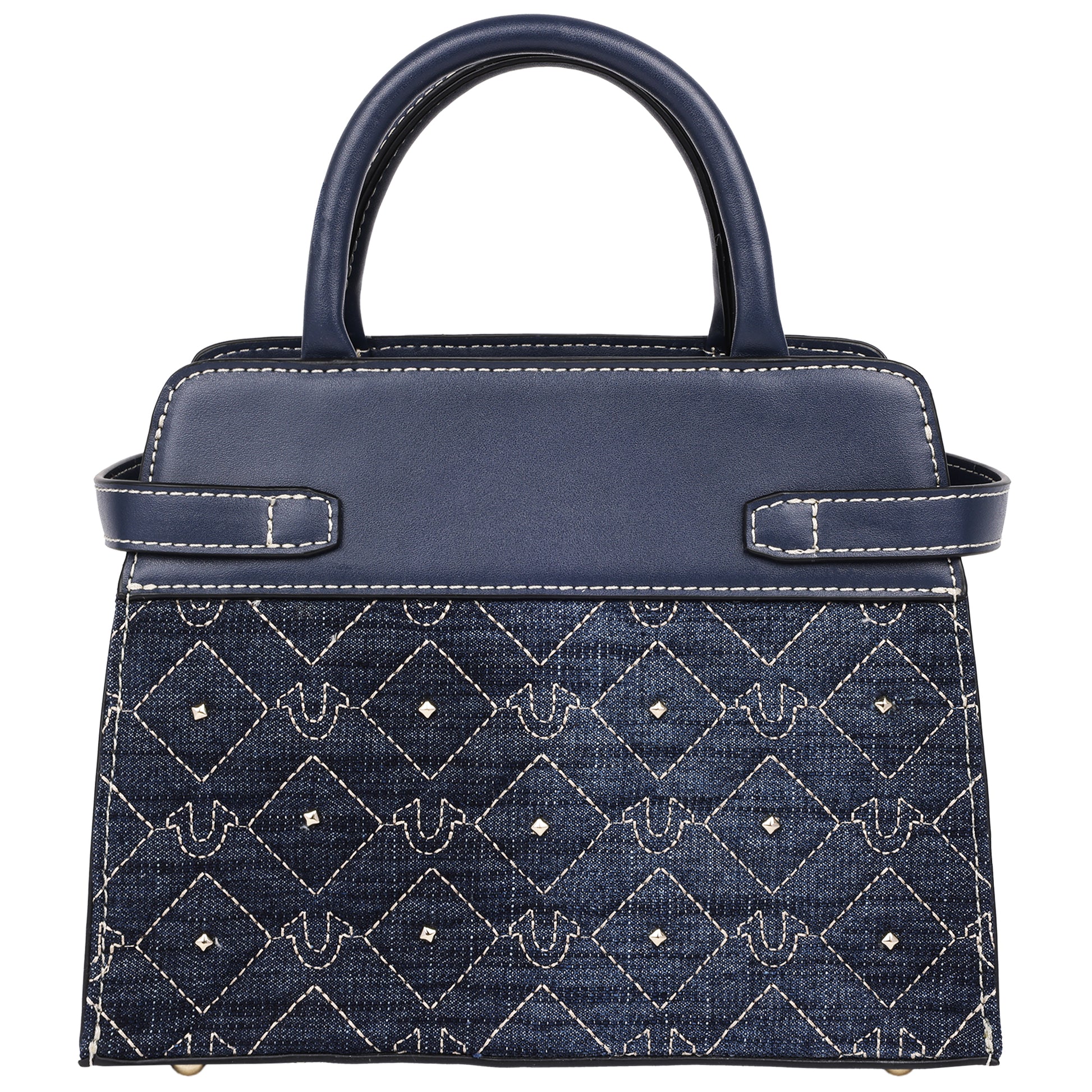 The True Religion Studded Denim Tote delivers a bold mix of casual denim style and refined detailing. Featuring an all-over quilted horseshoe pattern with gleaming stud accents, this tote is finished with polished hardware, buckle tab details, and contrast stitching. Dual top handles and a detachable crossbody strap offer versatile carrying options, while the structured silhouette and roomy interior keep essentials organized in style.