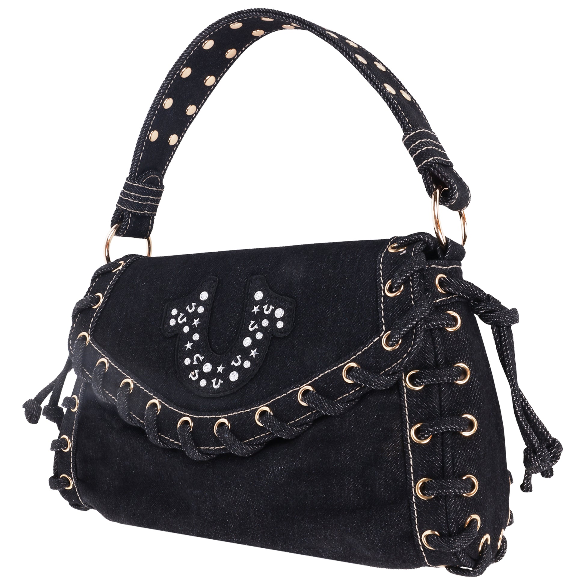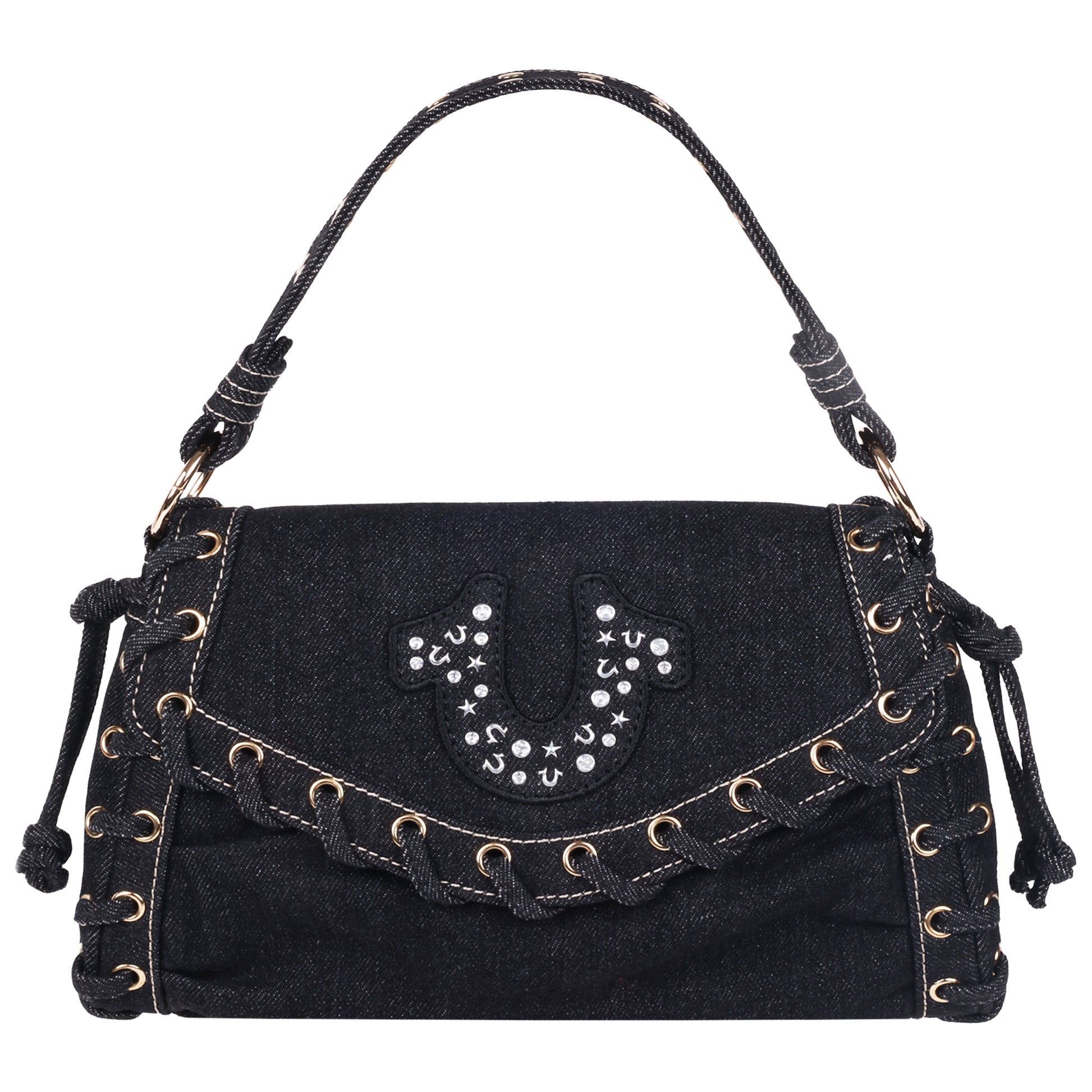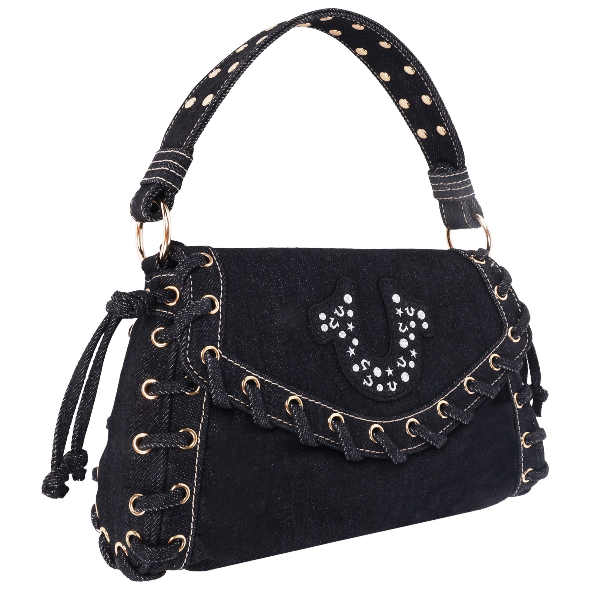 True Religion Studded Horseshoe Eyelet Denim Flap Bag