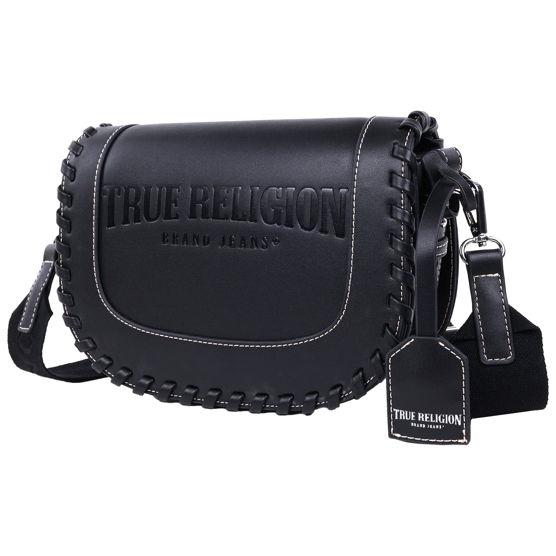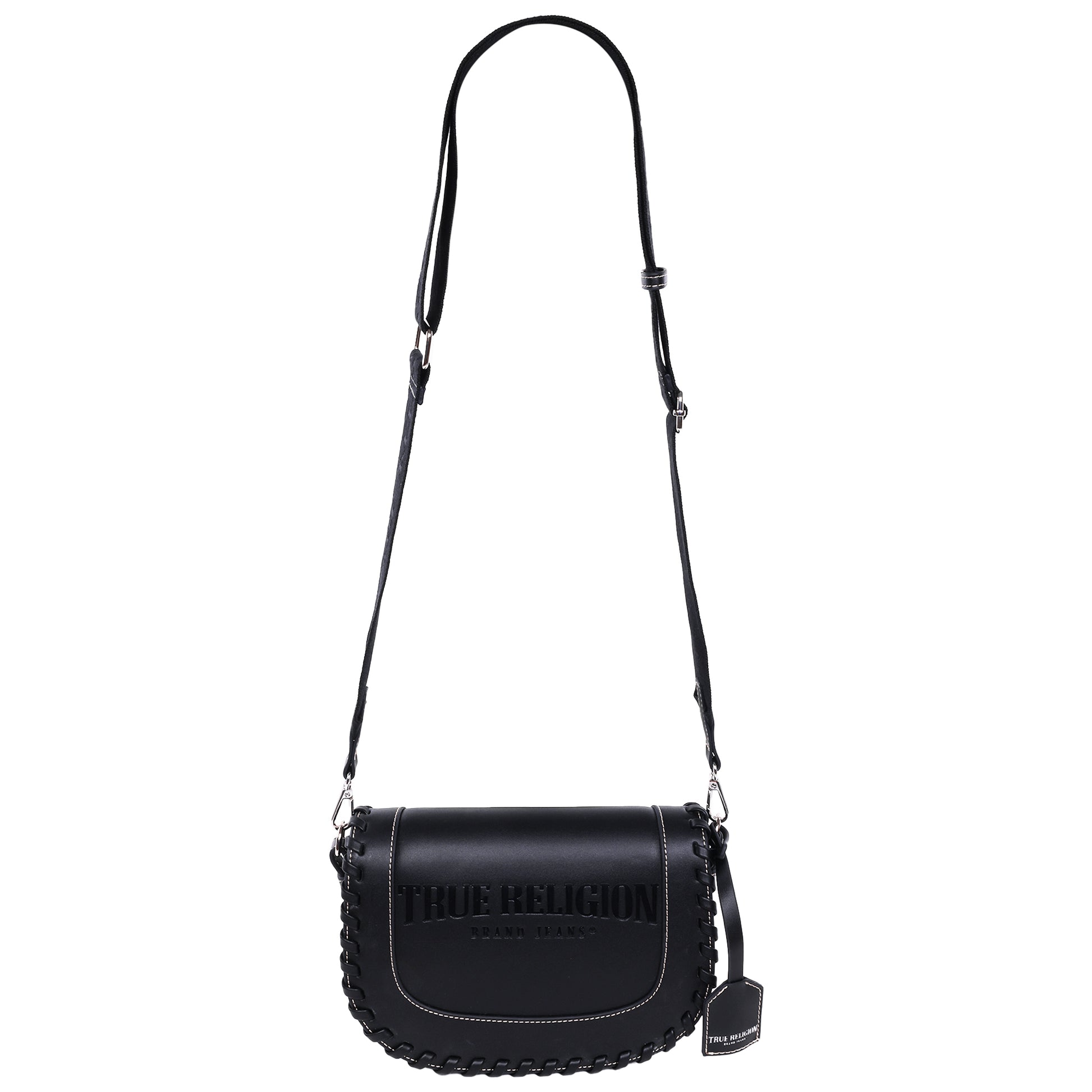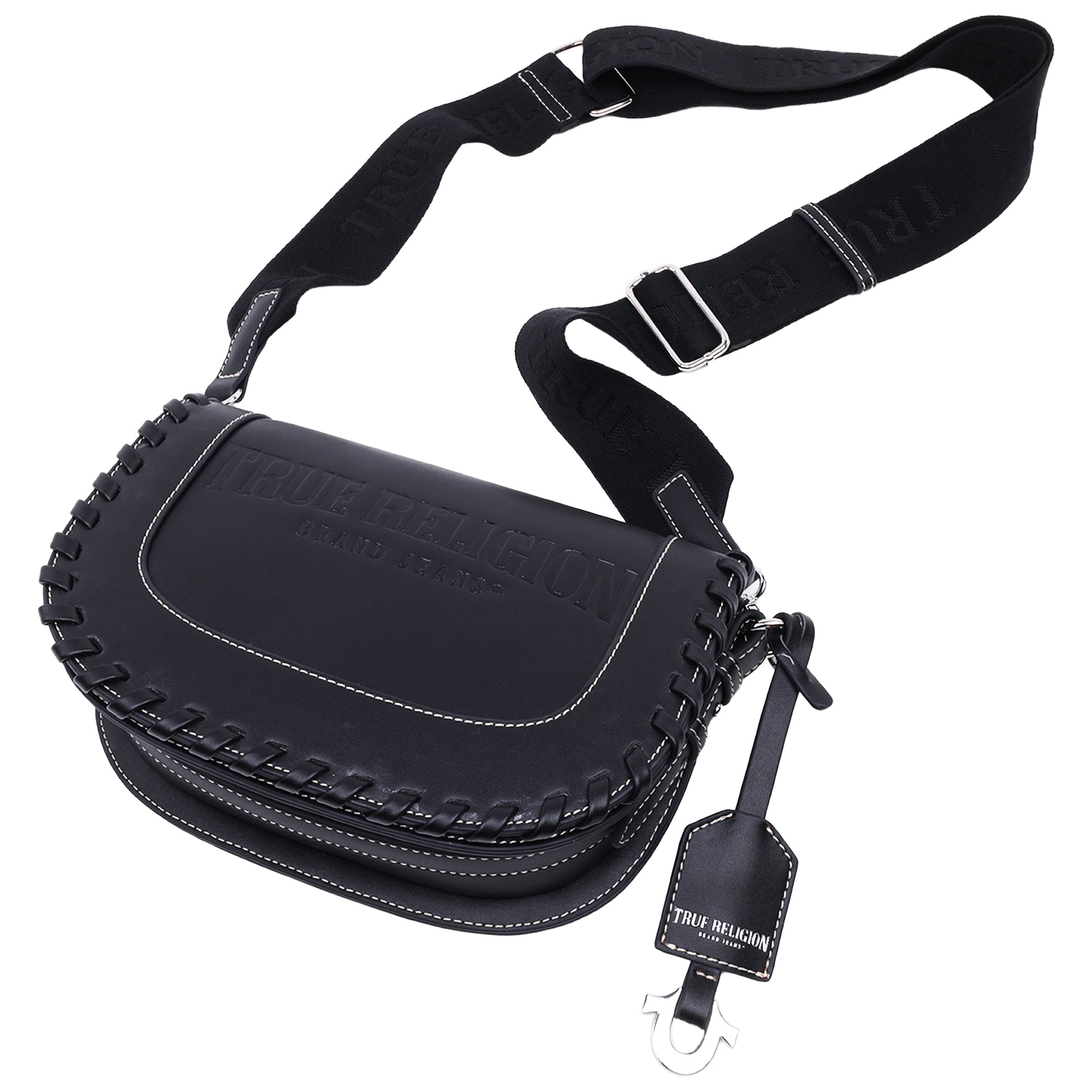 Western-inspired edge meets iconic branding in the True Religion Whip Stitch Saddle Bag. Crafted with a rich, structured finish and bold whipstitch detailing, this flap bag features a debossed True Religion logo and wide canvas logo strap for added attitude. Whether worn crossbody or on the shoulder, it's a standout piece for street-style loyalists. Ideal for adding a bold, branded touch to casual looks.