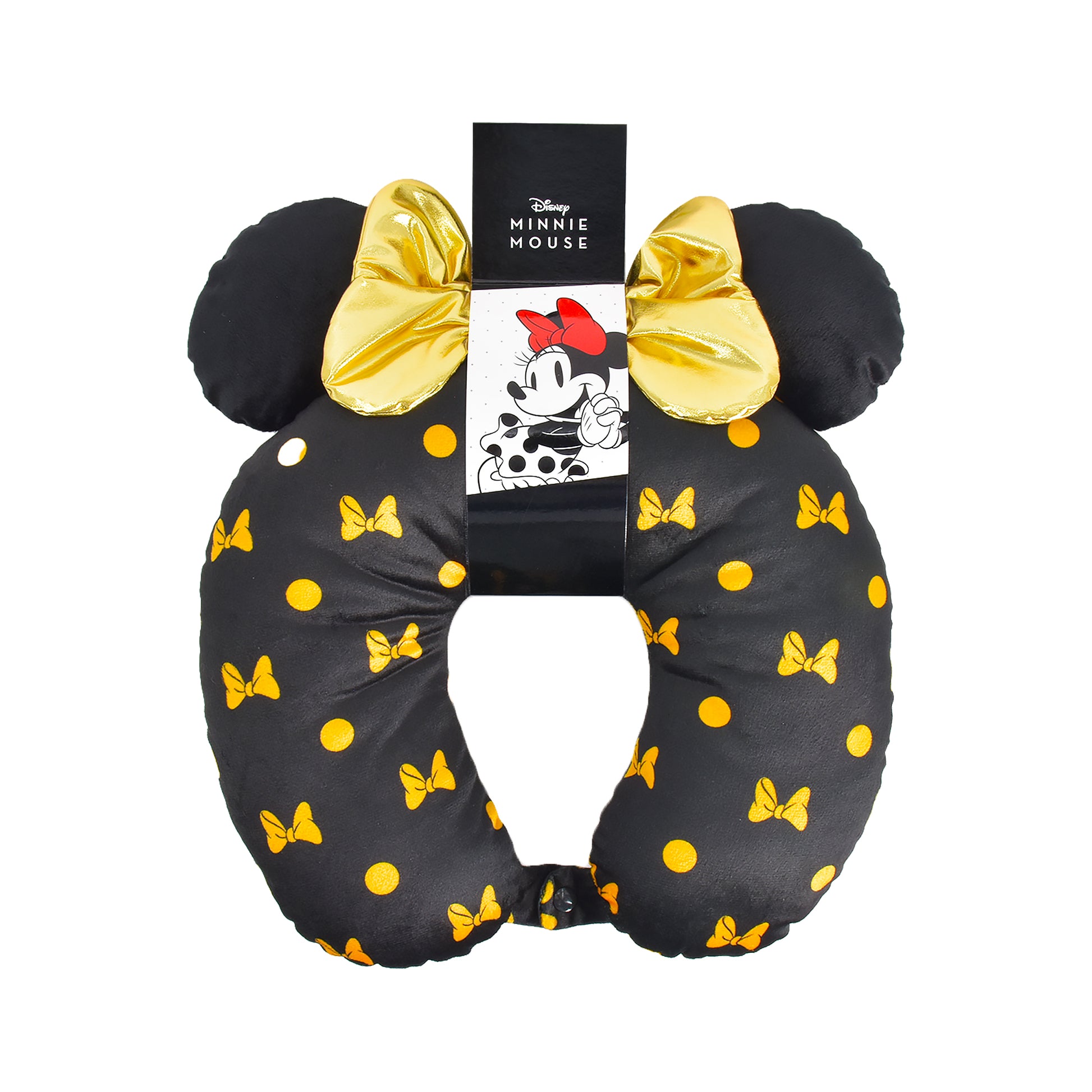 Experience travel comfort with the Disney Minnie Mouse Travel Neck Pillow. Made from soft, durable foam polyester, this black and yellow U-shaped pillow features charming 3D Minnie ears and bows along with iconic Minnie designs. Its ergonomic support helps reduce neck pain during long flights, car rides, or office naps. Lightweight and portable, it includes a snap closure for easy attachment to your luggage, making it the perfect travel companion for maintaining comfort wherever you go.