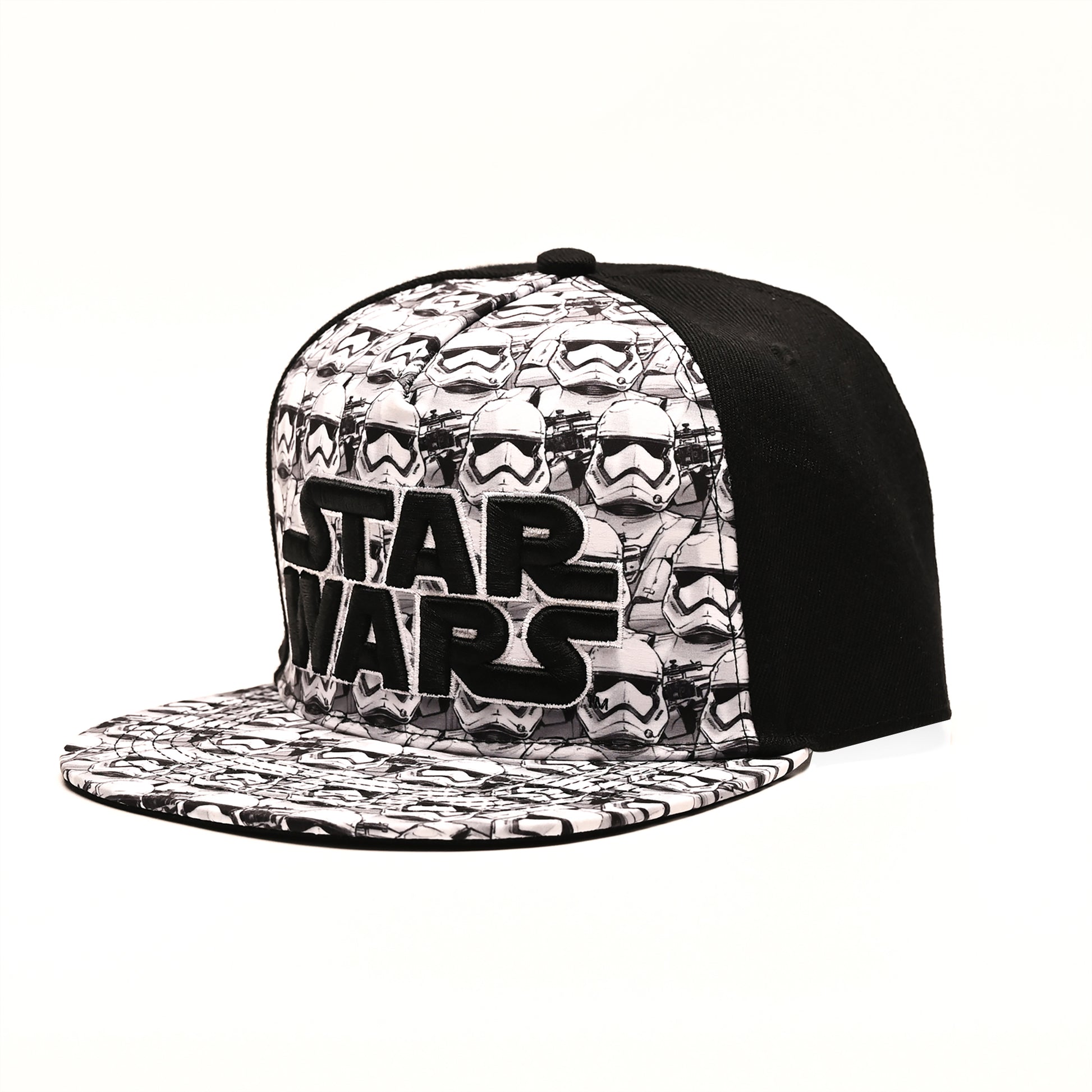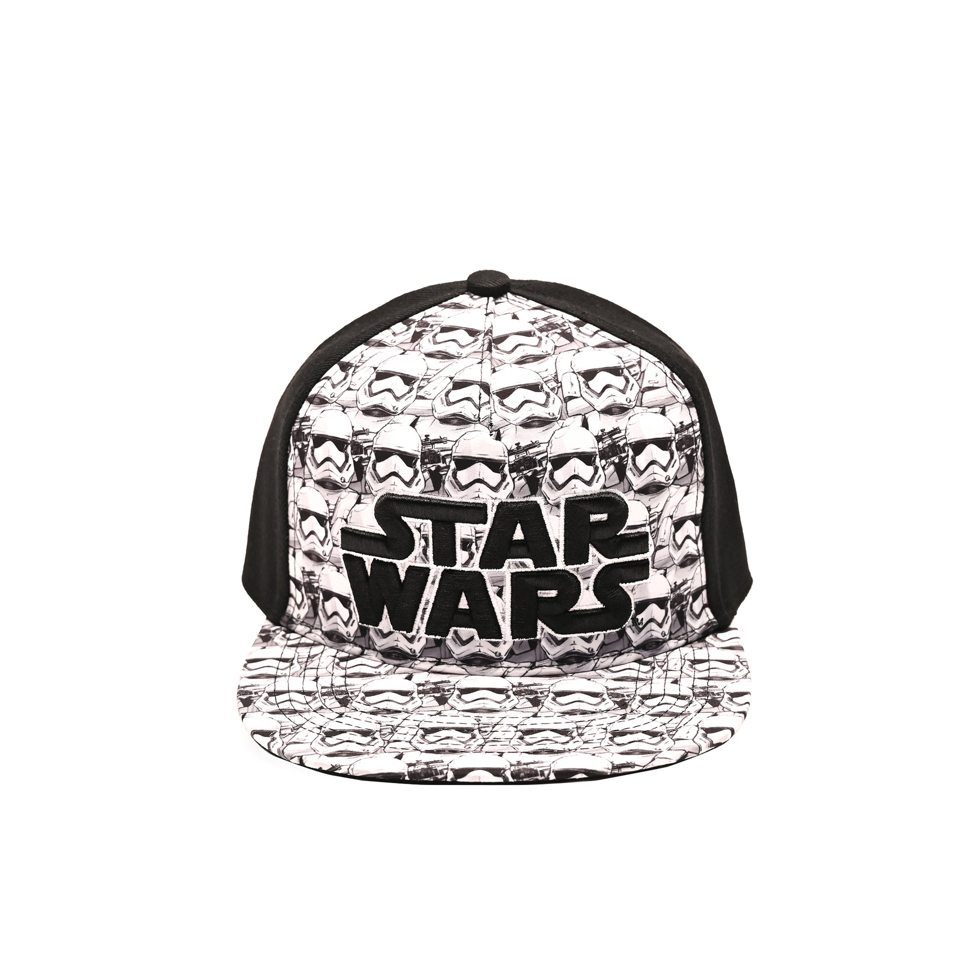 Disney mens Star Wars Embroidered Logo and Stormtrooper All Over Adjustable Snapback Baseball Hat with Flat Brim Black White One Size, Black, One Size US